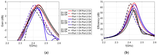 Here we can have all the aforementioned polarization by controlling the amplitude and phase of the excitation of each port. So, by not exciting one of the ports, we can utilize linear polarization while by using a phase difference of 90° degrees with the proper amplitude ratio we can utilize circular polarization. The gain along with the efficiency of each case is given in Figure 11, where we observe that the Gain (dBi) of the antenna ranges between 3 and 5.5 dB while the efficiency is above 50% for the operation BW of each case. The efficiency is reduced compared to a common patch but this is a result of the bandwidth enhancement [] of each resonance and not of the use of PIN diodes.
