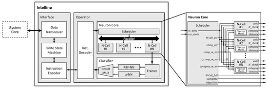 Intellino is the AI processor involving optimized features for embedded systems. The AI algorithms described in Section 2 are included in the neurons, and this leads to the low power consumption and lower resource utilization of the system. The single neural network-based architecture with parallelized neurons reduces the workload of the system core by facilitating the simultaneous massive recognition. The dedicated protocol enhances the repetitive AI operation (learning/recognition) through the interface module. The microarchitecture of intellino with operation flow and the details of hardware realization to apply intellino in an embedded system are described below.