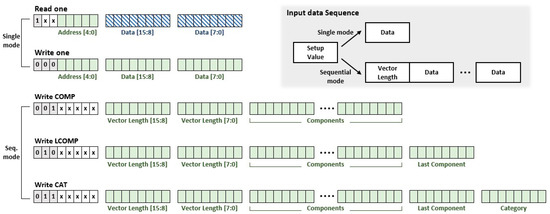 Intellino also facilitates the efficient learning/recognition through the dedicated protocol. As intellino targets an embedded system, the data transceiver employs the serial interface to reduce pin mapping with the system core. Also, the FSM enables the repetitive data receiving for successive learning/recognition. As shown in Figure 2, the interface communicates data in 8-bit. The first 8-bit is a setup value, which involves the information of single/sequential mode, write/read mode, and an address for the neuron core operation. When the single mode, the 16-bit data are attached right after the setup value for receiving the read data or transmitting the write data. In the case of sequential mode, the dataset length in 16-bit is notated, and the consecutive data, which include components and category, are delivered. For example, the learning is executed by write category (CAT) command, transmitting the setup value, data length, and dataset with category. The recognition is performed with write last component (LCOMP) command, transmitting the setup value, data length, and dataset. Intellino prints out the result of recognition by read one command, which shows the classified category or the calculated nearest distance depending on the address. The address indicates the command for data/distance/category or algorithm and enables the system to get the desired result with the read one command. As the interface is full duplex, the read one command transmits dummy data for receiving the desired data. Through this method, the protocol enables the system to perform learning/recognition without additional overhead, even though the dataset is bigger. Furthermore, since the protocol is based on the serial interface, the system can generate a learning/recognition library with a built-in interface and operate intellino efficiently.