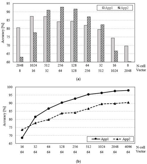 Figure 3 shows the relation between the N-cell counts, vector sizes, and accuracy depending on the applications. In Figure 3a, application 1 (App1) includes audio-based dataset [34] with two categories, the application 2 (App2) includes an image-based dataset [35] with five categories. As raw data are inadequate for learning/recognition in terms of accuracy as well as data quantity, the raw data should be pre-processed and organized for extracting the feature data for the efficient AI operation. In the case of App1, the audio-based data are pre-processed by a short time Fourier transform (STFT) [36], which extracts the feature regarding the frequency over time. As App1 is for the classifying words and each word has its own frequency, the extracted frequency dataset is used for the recognition. In the case of App2, which is for classifying hand-written digit images, as the image-based dataset is well-organized and the feature dataset by itself, the resizing with linear interpolation is only performed according to the vector sizes. In order to perform learning/recognition with the neurons of intellino, the 2D featured datasets of audio and image are flattened into a 1D array. As shown in the graph, App1 shows the highest accuracy of 87.4%, with 1024 N-cells and 16 vector sizes, and App2 has an accuracy of 92.8% with 256 N-cells and 64 vector sizes. The experimental results show that each application has the suitable combination of the N-cell counts and the vector sizes.