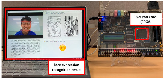 In order to analyze the concrete workload of AI system, we implement intellino on the FPGA, as shown in Figure 4. The neuron core with 32 N-cells and 256 vector size is implemented on intel DE2-115 evaluation board with Cyclone-IV FPGA. We adopt a face expression recognition application to demonstrate the real-world system applicability of intellino. We generate the training dataset for classifying the face expression of three categories, smile/angry/snooze, and pre-process the raw data and extract the feature data with a CPU-based system. The raw face image is taken from the camera, and the face region is cropped with Haar-like feature [37] for excluding the background. The cropped image is converted into a grayscale image, and Canny edge detection [38] derives an edge for acquiring the feature of face expression. For the more efficient recognition of expression with the face image, the regions near to the eyes, nose, and mouse are extracted for generating the feature dataset. After the pre-processing, the featured training datasets are stored (trained) in each of vector memories of intellino. With trained intellino, the recognition of face expression is performed. The image for recognition is also taken from the camera and pre-processed with the same process as the training dataset. The pre-processed test dataset is delivered to intellino and calculated with every trained dataset in intellino. Thanks to the parallelized neurons, the multiple calculations for classification are promptly conducted. Even when the trained dataset is increased in intellino, the calculation time for recognition is always the same. Then, the result of recognition is transmitted to the system and displayed. The recognition achieves 90.19% accuracy with 36 datasets by k-fold cross validation, 12 datasets for each category and 10/2 for training/test datasets, and the operation with real-time capturing demonstrates the functionality of intellino. Through the face expression recognition application with the classical camera, we analyze the workload of the AI system step by step. Although the AI system has the most workload at the recognition step, the parallel computation of intellino takes charge of the repetitive recognition and improves the system performance by lessening the workload. As intellino receives the feature data for learning/recognition, the system can substitute other sensors for the classical camera. Finally, as the pre-processing in accordance with the attached sensor generates and delivers the feature data to intellino, we also discover that intellino only requires the interface with the neuron core for the data transmission with the system core, which lightens the peripherals of intellino.