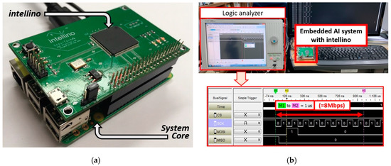After the workload analysis, we finally design the prototype board of intellino for an embedded AI system. Figure 5a shows the integrated AI system with intellino, which is realized on intel MAX10 FPGA and supports up to 88 MHz operation. The prototype board includes the FPGA and joint test action group (JTAG) connector for intellino realization and the general-purpose input/output (GPIO) header for integration. The header enables the system core to be easily connected to intellino and to get external signals for learning/recognition. As intellino adopts a serial interface while employing fewer pins, which is directly related to the size of edge device, the system core can utilize the other GPIOs for various applications. Intellino achieves the same accuracy as the optimized algorithm-based simulator and performs according to the analyzed workload. Therefore, we can operate various AI applications based on image and audio by building the embedded AI system with prototyped intellino. In order to perform the AI operation with the embedded system, we develop a library for the system core including the learning/recognition functions. As the library is based on the built-in interface of the system core and the designated protocol of intellino, the embedded system can easily perform the repetitive AI operation of learning/recognition with pre-processed datasets.