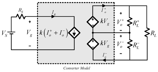 In many applications, the PV system is connected to a bipolar grid in parallel with other sources. When the same model of controlled sources is considered, the equivalent circuit from the bipolar network is useful because it allows the analysis of the power flows and establishing the range of powers when the converter works in CCM mode. In this case, from the terminals of the bipolar grid, the equivalent circuit of the converter can be obtained. Figure 5 shows the equivalent voltage, which is kVS, and the value equivalent resistance, 2k2RS.