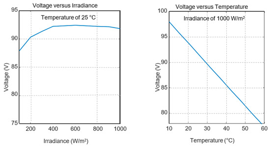 In the maximum power conditions, the voltage varies from 85 to 92.5 V, depending on the irradiance, for a temperature of 25 °C. On the other hand, when the irradiance is 1000 W/m2, the voltage varies from 75 to 98 V, according to the temperature. Figure 7 shows the variation in the output voltage for different irradiances and different temperatures.