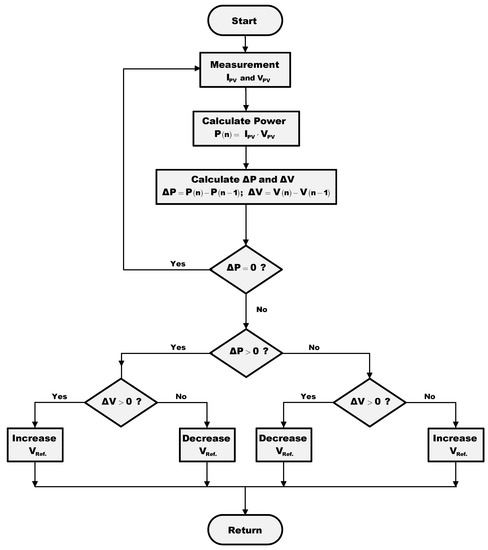 For the control of the converter, several strategies can be applied to the proposals in the technical literature for converters of one input and one output [18,19,20,21,22,23,24]. In this work, the technique chosen allows maximum power point tracking. The perturb and observe method (P and O) is one of the most used in practice [24]. It is an iterative method where the reference voltage varies according to the increase in power, obtained from the input voltage and current to the converter. Figure 8 shows the flowchart of the P and O strategy.