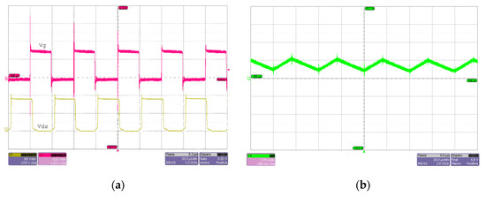 The maximum input current is given for the maximum power, it is 8.17 A. On the other hand, the maximum ripple of the input current is set to 4%. The application of Equation (15) results in an inductance, L1, of 5 mH.