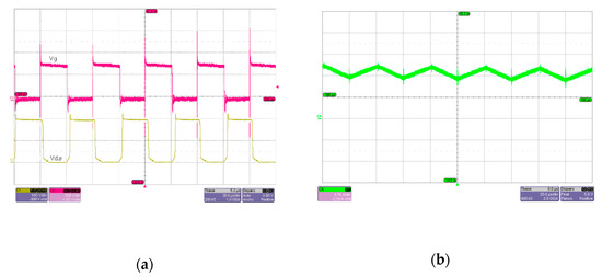 When the PV system and source are connected (Figure 9, S1 and S2 are closed), the voltages at the point of connection are Vdc+ = −Vdc− = 99.7 V. From the theoretical point of view, Equation (14) must be fulfilled, therefore at the maximum power point, k must be 1.09 and the theoretical duty cycle will be 52%. The converter supplies a current IGD+ = −IGD− = 3.2 A, so the power transferred by the converter is 638 W. The input voltage (VPV) is 92 V and the input current is (IPV) 8.1 A. Figure 12 shows the gate source signal, Vg, drain source voltage, Vds, and the input current waveform. In this case, the measured duty cycle is about 51%. In this test, the measured efficiency of the converter is 86.5%.