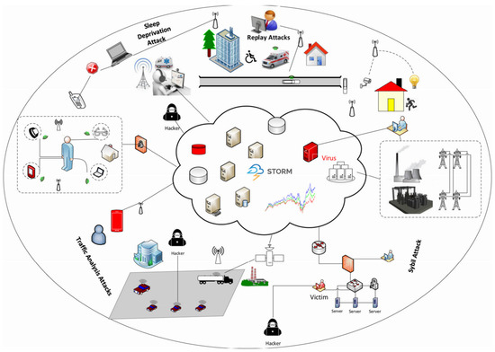 The ubiquity, smartness, and communication abilities of the Internet of Things (IoT) devices coupled with cloud, provide tremendous assistance in healthcare, industrial control systems, smart homes, and transportation [7,8,9]. As signposted by CISCO, the estimation of IoT revenue will be approximately $14.4 trillion between 2013 to 2022. On the other hand, security and privacy threats such as disruption of IoT networks, Denial of Service (DoS) attacks, and traffic analysis attacks are the main problems in the digital investigation in a cyber-crime scene [10,11]. An illustration of security trepidation in IoT-based smart environments as shown in Figure 1.
