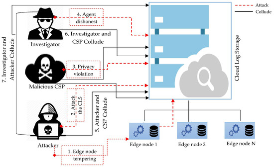 For a forensic data collection, an edge cloud environment must be taken into account for possible security risks, such as log leakage or forensic data removal. Unlike traditional cloud infrastructure, the edge-cloud services are supported using fog nodes. Security monitoring is inadequate with edge nodes delivering services because they are locally isolated from the cloud [51]. This geographical division of management is the main target of malicious users or attackers. Moreover, the log data of edge nodes cannot be securely stored and maintained at cloud storage. Furthermore, several manipulated log data can be entered, and log removal may be performed to prevent forensic investigators for the reincarnation of crime scenarios using the logs.