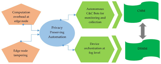 - Privacy-Preserving Automation: To avoid the computation overhead in edge node devices, where real-time IoT devices are producing data continuously, we used microservices orchestration for managing the integration of IoT devices at fog node. It provides continuous integration and less downtime during service migration. We used C&C automated bots in containers for autonomous log collection and preservation. Figure 6 gives the security feature modeling of privacy-preservation automation.