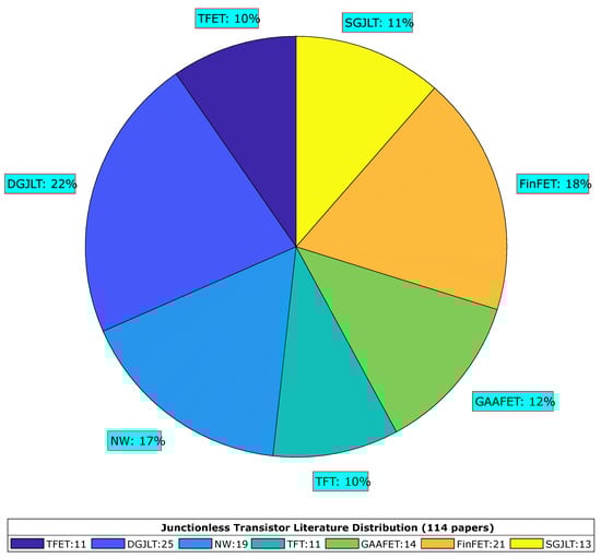 Junctionless transistors can be divided in two main categories: depletion-based and tunnel-based JLTs. In depletion-based devices, the amount of electrical current flowing through the device depends on the dimension of the depletion region, which is controlled by the applied gate voltage. In tunnel-based devices, the electrical current is governed by band-to-band tunneling (BTBT). JLT categories can be then classified based on the geometrical shape, material composition of the channel, as well as the gate structure. When a single gate on the top of the channel controls the current through the device, it is known as Single Gate junctionless transistor. If an additional gate is present below the channel, then it is called Double Gate junctionless transistor. If the transistor channel thickness is very thin (≤10 nm) and the channel material is not monocrystalline silicon, then it is known as Thin Film junctionless transistor. Gate-All-Around JLTs are characterized by a gate electrode that entirely surrounds the channel of the transistor; the channel can be either cylindrical or rectangular. When the transistor channel is a tube-shaped nanostructure, it is called junctionless Nanowire. If the electronic device is a fin-shaped transistor, it is called junctionless FinFET. This simple classification is coherent with the analyzed literature, whose distribution is shown in Figure 1. Although most of the reported junctionless transistors are inorganic electronic devices, organic solutions were also proposed [103,104,105,106,107,108]. In this work, we focus on inorganic junctionless transistors, where the following parameters as considered as the main figures of merit: the Drain-Induced Barrier Lowering (DIBL), which represents the drain voltage influence on the threshold voltage, defined as [109]; the Subthreshold Swing (SS), which can be defined as the change in the gate voltage required to decrease the drain current by one decade () [110]; the ratio, which is the ratio between the maximum available drain current, (, ), and the current in the off state, (, ).