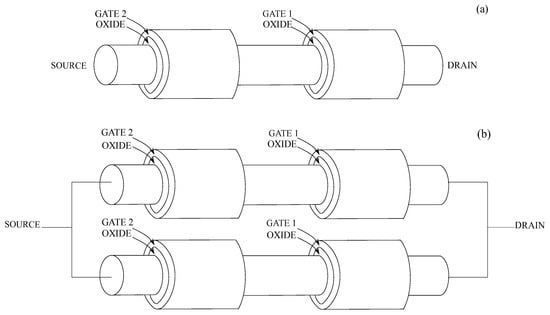 Apart from engineering the gate oxide structures, the designer could also increase the number of gates. If two gates are present, the structure is defined as a twin gate transistor (Figure 7). Such a structure allows implementing logic gates easily since two inputs are present [34]. The twin gate structure can also be applied to a double channel GAAFET, as shown in Figure 7b. A fabricated twin gate double channel GAAFET showed an ratio of 7 × , a of 83 mV/V, and a of 105 mV/dec [33]. Besides silicon and polysilicon channel junctionless GAAFETs, devices composed of other materials were also reported: a gallium arsenide junctionless GAAFET was simulated, leading a value near to the theoretical limit ( mV/dec at K) [27]. A germanium junctionless GAAFETs was compared to a silicon one, and it provided lower , and ratio (data in Table 1) [35]. The channel material composition also influences the threshold voltage sensitivity to the temperature: considering silicon, gallium arsenide, indium arsenide, and indium phosphide, the minimum and maximum threshold voltage variations were observed for indium arsenide and silicon, respectively [37].