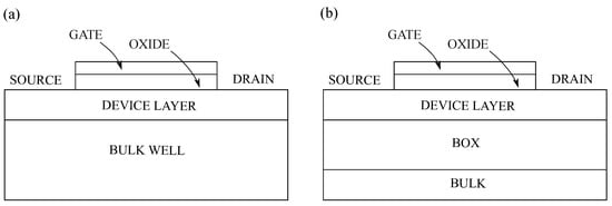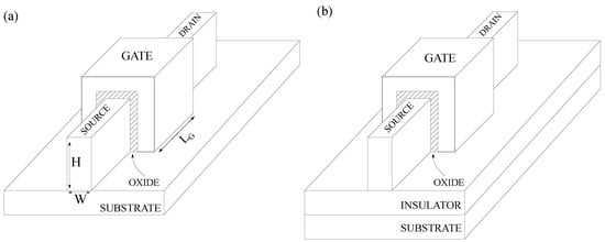 Figure 8a shows a schematic of a bulk junctionless FinFET. The device can also be fabricated on the top of an insulator layer, as shown in Figure 8b. In that case we define it as an SOI FinFET. Dimensions of these transistors strongly affect their performance. Considering bulk junctionless FinFETs, increasing the fin width (W) from 6 nm to 15 nm can lead to a variation of approximately and for and , respectively; changing the gate length () from 12 nm to 21 nm can lead to a variation of approximately for and for [12]. Variations in the fin height (H) are more critical in terms of analog performance [19]. With respect to the inversion mode device, the junctionless FinFET presents lower . This is attributed to the low carrier concentration and high electric field in the middle of the channel in the state. As compared to SOI FinFETs, the bulk structure presents an additional degree of freedom in the design: by varying the doping concentration of the substrate from 1 × cm to 1 × cm, a change of in the threshold voltage can be obtained [4]. Furthermore, it also provides lower and . From an analytical point of view, it can be modeled from conventional triple gate (TG) structures [3,20]. An alternative structure is the so-called SON (Silicon On Nothing). In this structure, the silicon layer is isolated from the substrate through a selective etching. This design choice implies a more complex fabrication process with respect to the bulk structure [5].