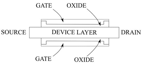 Figure 13 shows the structure of a double gate junctionless transistor. Many models were proposed, and the difference among them depends on the approximations that are involved in the derivation and the considered effects. For instance, many models do not consider short channel and quantum effects [53,55,58,66], while others are only valid for certain doping concentrations and device layer thickness ranges [59,61]. Quantum effects are critically important, because they can affect the threshold voltage [74]. The main issue is modeling the transition between the depletion and the accumulation regions, since the physical behavior is not the same in the two operating regions [56]. A technique involving high doping concentration in the device layer can be considered to reduce the model complexity. This assumption allows for simplifying the depletion width modeling or using the separation of variable in the Poisson equation [62,67].