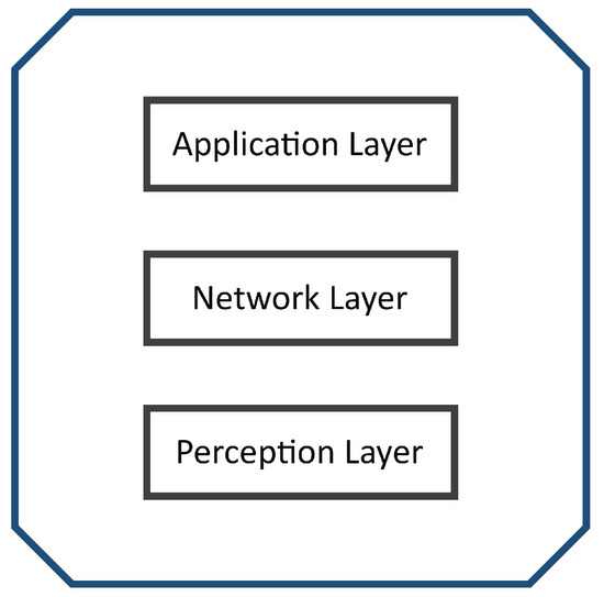 - A 3-layer architecture. The most common and basic model is a 3-layer architecture comprising of the perception, network and application layers [3,4,43], as depicted in Figure 2, the perception layer is also called ‘the device layer’ that includes physical devices and sensors. The network layer is also named ‘the transmission layer’, which should securely transmit the telemetry data of sensors to processing and data analytical systems. The application layer offers global management of applications using the systems at the network layer.