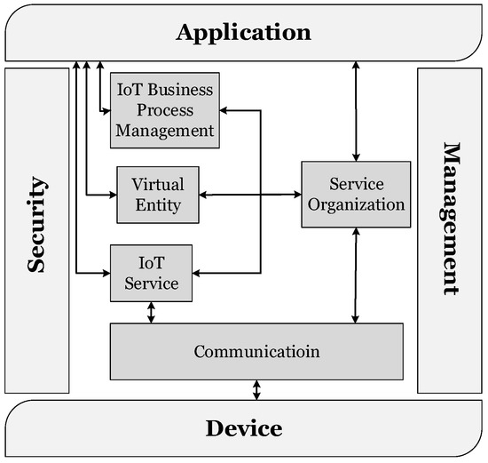 Figure 4. IoT-A functional view [6,46]. - An IoT Reference Architecture developed by Web Service Oxygen (WSO2). WSO2, an open-source technology provider, has proposed an Architectural Reference Model based on its skills in the IoT solutions development. Figure 5 depicts the WSO2 recommended architecture. It consists of five layers: (1) Client/external communications—Web/Portal, Dashboard, Application Programming Interface (APIs), (2) Event processing and analytics (including data storage), (3) Aggregation/bus layer—Enterprise Service Bus (ESB) and message broker, (4) Relevant transports—XMPP/CoAP/AMQP/HTTP/MQTT, etc. and (5) Devices [47]. The model includes the cross-cutting layers that have (1) a device manager, and (2) an identity and access management system.