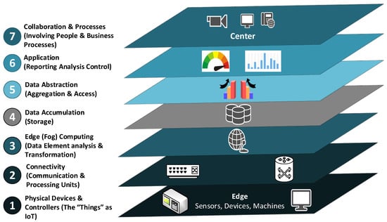 The IoT architecture consists of physical objects integrated into a communication network and supported by computational equipment to deliver smart services to users. The IoT system should be capable of connecting billions of heterogeneous devices through the Internet, so there is a need for a layered and flexible architecture. There are numerous architectures and reference models proposed by various authors and organizations but those have not yet converged to a formally recognized reference model [3,4,5,6,7,42,43,44]. The most common architectures and reference models (the terms “architecture” and “reference model” used interchangeably by the authors) are explained as follows: