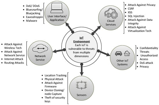 One active attack is when the IoT system is used as a vector to launch massive DDoS against Internet systems. IoT systems are a suitable vector for these attacks because of their large numbers and comparative ease of their compromise, due to poor security practices and weak defense mechanisms. Mirai can be used as an example of a botnet attack through for compromising IoT systems [11,55,56]. IoT systems face many threat dimensions from multiple directions, including user interface, cloud services, other interconnected IoT systems associated to sensors and network services [12], as shown in Figure 7. A discussion of these dimensions is presented in the following subsections.