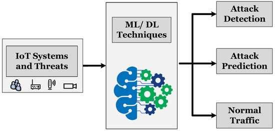 For protecting IoT systems against cyber threats, another line of defense should be developed in IoT networks. Intrusion Detection Systems (IDSs) fulfill this purpose [14,15]. Various surveys have attempted to describe machine learning-based IDSs for protection against IoT networks or compromised IoT devices. The surveys cover research work on IDSs for cloud-based IoT systems [16], Wireless sensor networks [17,18,19], cyber-physical systems [20], and mobile ad hoc networks (MANETs) [21,22,23]. However, traditional IDS methods are less effective or insufficient for the security of IoT systems because of their peculiar characteristics mentioned above, in particular, limited energy, ubiquitous, heterogeneity, limited bandwidth capacity and global connectivity. Machine Learning (ML) and Deep Learning (DL) based techniques have recently gained credibility in a successful application for the detection of network attacks including IoT networks. This is because ML/DL based methods can capture benign and anomalous behavior in IoT environments. IoT devices and network traffic can be captured and investigated to learn normal patterns. Any deviation from these normal learned patterns can be used to detect anomalous behavior. Furthermore, ML/DL based methods have been tested to predict new or zero-day attacks. Hence, ML/DL based algorithms provide robust security protocols for designing the security of IoT devices and networks.
