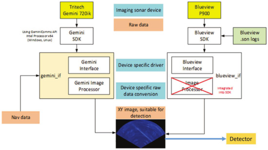 Figure 3. The image shows the workflow to obtain a device-independent XY-Image. The sonar imaging devices, e.g., Gemini 720ik, Blueview 900-130 are controlled by their SDK to generate raw sonar data, which is processed by the image processor to convert RT raw data into XY-Images, which are then fed in, online mode, to the detector.