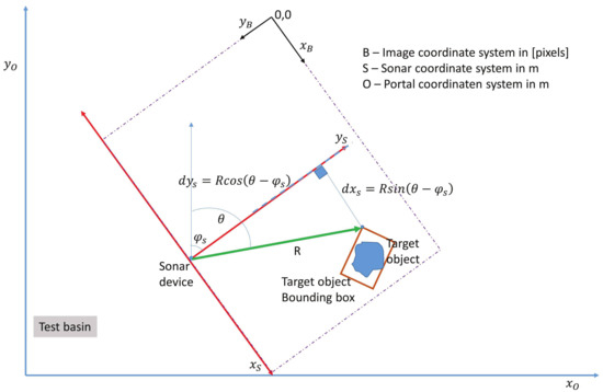 R of the corners of the bounding box of the target object are calculated in the test basin coordinate system O relative to the sonar device. Secondly, using the calculated bearing