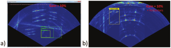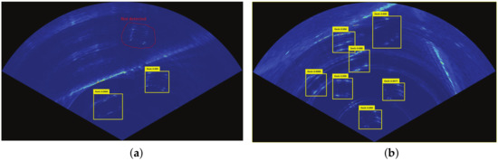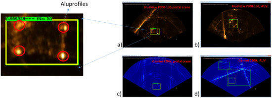 In the final step, the pixel position is obtained in the image coordinate system as follows. In the image with the origin at the top left corner of the image, the position of the sonar head is assumed to be at position . Adding and to the position of the sonar head, we get the position of P in the image as . The calculations are repeated for every corner of the bounding box of the target object and using the pixel coordinates obtained previously, the image can be annotated to get the XML file. Now, with the simple detector trained on the data from the structured environment (Test basin and portal crane), it can be used to collect a large dataset in an unstructured environment, e.g., sea using a sonar device mounted on an AUV. In this case, images are captured, objects in the images detected and classified and their bounding boxes used for annotation using a Pascal VOC writer. These annotations must be accurate. For this reason, human oversight is required for all of the images in the dataset. It is obvious that the task of only checking and correcting a set of mostly correct annotations is less time consuming than labeling a complete set of images. Consequently, saving a few seconds per image could save several hours of work on a large dataset. For the automatic annotation, a threshold score should be set to suit the dataset and the operator’s needs and should balance the unnecessary annotations against the miss rate. If removing falsely annotated objects is easier for the operator than generating new labels for the missed ones, a lower threshold value should be set to reflect this.