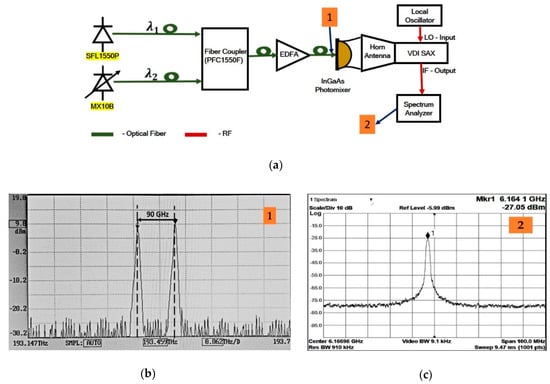 The optical channel of the MMW wireless communication link consists of two CW laser sources, IQ-MZM, Modulator Bias Control (MBC), Arbitrary Wave Generator (AWG), Erbium-Doped Fiber Amplifier (EDFA), Fused Fiber Polarization Combiner/Splitter, and optical fiber cables. The two independent laser sources used to generate the two optical signals are necessary for generating the required THz frequency difference . The first laser source is based on a Single-Frequency Laser (SFL), SFL1550P, from Thorlabs operating at λ1 = 1550.07 nm. The SFL1550P source is current- and temperature-controlled, which allows tuning to specific wavelengths and power, which is essential to obtain the required MMW or THz-carrier frequency difference. The second laser source λ2 = 1549.35 nm, is based on telecom modulation device, MX10B from Thorlabs. The MX10B is compatible with International Telecommunication Union (ITU) transmission channels in a 1.5 µm band. Measurements of the two lasers’ exact wavelengths carried out using an Optical Spectrum Analyzer (OSA), AQ6331 from Yokogawa. The OSA is configured at 1549.73 nm central wavelength and 0.05 nm (5 GHz) wavelength resolution, which is the lowest resolution available for this device.