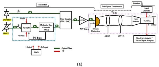 Recently, THz photonics wireless transmission link at 400 GHz was reported using On–Off Keying (OOK), Quadrature Phase-Shift Keying (QPSK), 16-Quadrature Amplitude Modulation (16-QAM), and 32-QAM based on photonics for THz generation [9]. A 64-QAM modulation format at 300 GHz with a data rate of 0.096 Gb/s reported using UTC-PD. A 100 Gb/s transmission was demonstrated using a dual-polarization 16-QAM method in the W-band [10]. UTC-PD-based photonics at the transmitter and active Microwave Monolithic Integrated Circuits (MMICs) at the receiver was demonstrated experimentally at 237.5 GHz [11]. The 8-PSK modulation format was successfully transmitted at 240 GHz enabling a 30 Gb/s data rate capability [12]. Higher digital modulation formats are possible by integrating Mach–Zehnder Modulator (MZM) to one of the laser sources. A modified dual-drive In-phase and Quadrature (IQ) modulator driven by equal amplitude binary signals for generation of offset-free QPSK and 16-QAM constellations has been reported [13]. The MMW and THz coherent receivers rely on the availability of carrier phase-locking to the transmitter. Thus, after signal detection, digital synchronization (off-line demodulation) is required in order to construct the constellations (IQ map) and eye diagrams [11,12].