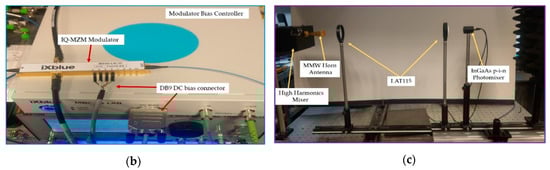 Experimental set-up. (a) Proposed MMW wireless communication link based on InGaAs p-i-n photomixer and receiver. (b) IQ-MZM modulator and the Modulator Bias Control (MBC). (c) The free space transmission overview.