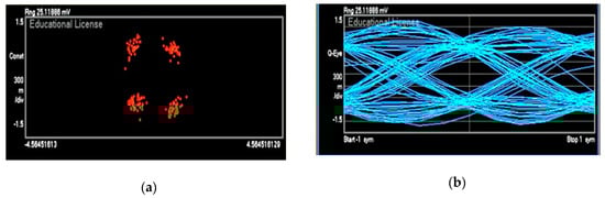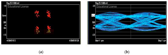 When the signal power was increased by 0.5 Vpp, as shown in Figure 5, the IQ constellations and the eye diagram improved compared to the 1 V pp PRBS signals. The symbols are close to the ideal IQ symbol placements and the symmetry of the symbols improved. The eye diagram opening is broad and clear without a symbol crossing. By further increasing the bit energy of the transmitted signal, the constellation and the eye diagram measurements can show an improvement. Figure 6 shows an open and clean eye diagram with a better symmetry of the symbols for 3.5 Vpp PRBS signal input.