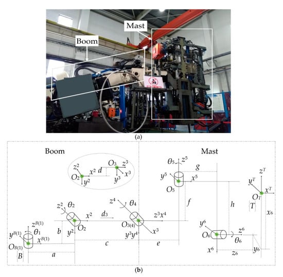 Figure 1a shows the heavy-duty mechanical arm of a roof bolter and can function as a typical example of airborne heavy-duty mechanical arms in coal mine. Figure 1b shows the kinematics model of the airborne heavy-duty mechanical arm with six joints, which defines the coordinate system of each joint. {B} is the base coordinate system and {T} is the tool coordinate system. OB, O1, O2, O3, O4, O5, O6 and OT are the origin of coordinate system {B}, {1}, {2}, {3}, {4}, {5}, {6} and {T}, respectively. The origin OT of the tool coordinate system {T} is the mast end of a roof bolter.