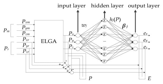 A three-layer ELM structure is shown in Figure 3. Pr = [Pxr, Pyr, Pzr] is the actual position measured using the laser tracker. Pm = [Pxm, Pym, Pzm] is calculated using the model before ELGA calibration. P = [Px, Py, Pz] is calculated using the model after ELGA calibration. The error E = [ex, ey, ez] between the actual position value Pr and the calibrated position value P is expressed as E = Pr − P.