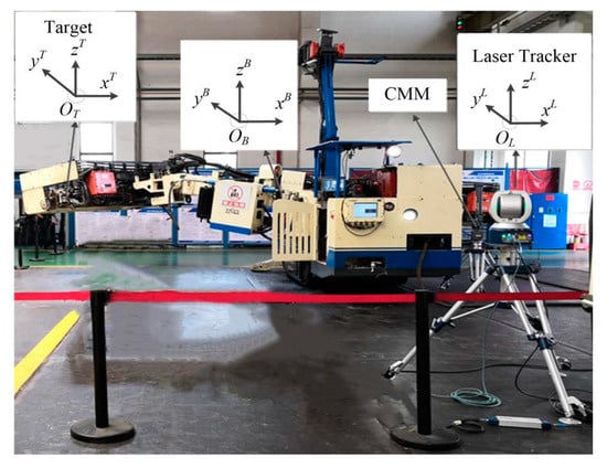 Before the calibration, it is necessary to collect multiple data sets of the actual mast end position and the nominal mast end position. As shown in Figure 4, the measurement setup of the heavy-duty mechanical arm of a roof bolter consists mainly of a coordinate measuring machines (CMM), a laser tracker, and a target ball. The laser tracker made by Faro Vantage is a portable coordinate measuring instrument with a measuring space of thirty meters. The measurement accuracy of the laser tracker is: ±0.1 mm. The target ball was installed at mast end, which is the origin OT of the tool coordinate system. Based on the principle of laser reflection, the position of the target ball was tracked to obtain the absolute position of mast end.