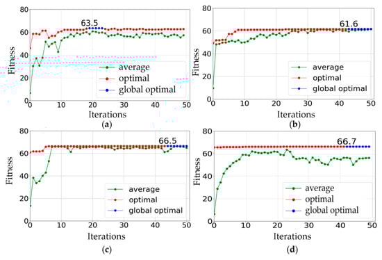 In Figure 5, “average” is the average fitness value of all individuals in each iteration in a run, “optimal” is the maximum fitness value of all individuals in each iteration in a run and “global optimal” is the maximum value of “optimal” in all iterations in a run.