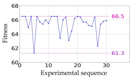 When population size = 30 and iterations number = 50, the statistical results of 30 experiments are shown in Figure 6, the individual with a fitness function value of 66.474 was selected as the optimal individual. The corresponding correction parameters vector is (∆a, ∆b, ∆c, ∆d, ∆e, ∆f, ∆g, ∆h) = (52.0, −8.0, −58.0, 31.0, 15.0, 16.0, 49.0, −2.0). The geometric parameters of the updated kinematics model are shown in Table 1.