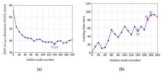 Twenty different networks with the number of hidden nodes range from 10 to 200 had been experimentally evaluated on training data set. Twenty experiments were conducted for each network. The simulation experiments were carried out in MATLAB environment running on a windows computer with a 2.60-GHz Intel Core i7-9750H CPU (Intel, Santa Clara, CA, USA) and 16.0 GB RAM. As shown in Figure 7a, as the number of hidden nodes was less than 70, the RMS of x, y and z directions MAXEs reduced as the number of hidden nodes increased. When the number of hidden nodes was more than 70, the RMS of the x, y and z directions MAXEs tended to be stable, but when the number of hidden nodes was 140, the RMS of the x, y and z directions MAXEs was the smallest.