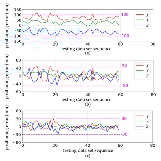 Positioning error contrast diagram on testing data set: (a) before calibration; (b) after the kinematics model was updated; (c) after the residual error was compensated.