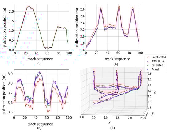 In the experiment, the mast end was commanded to follow a “III” shape trajectory. The result is shown as the three-dimensional graph in Figure 10d. Figure 10a–c represent the mast end motion curve in the y, z and x directions, respectively. In Figure 10, the red curve represents the track before calibration. The purple curve represents the track after the kinematics model are identified using ELGA. The green curve represents the track after ELGA-RELM calibration. The blue curve represents the actual mast end position. A total of 100 positions of the trajectory were collected in the experiment. It can be seen that the purple, green and blue tracks are close, and green track was almost coincident with the blue track in Figure 10, which proved that the errors after calibration were significantly reduced with the proposed calibration method in this paper.