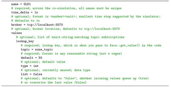 The communication configuration files generation function receives the market ID, the total number of houses, and the prefix of the controller inside each house as the input. The generated files are a .txt file and a .zpl file. The aim of the txt-formatted file is to configure the communication between the ns-3 process and the FNCS broker. The zpl-formatted file or FNCS ZPL (ZeroMQ Property Language) configure file, which is based on the ZPL (ZeroMQ Property Language) structure, configures the simulator to subscribe to the interesting topics, for example, market ID, submit bid state, market clearing price, average price, and the price’s standard deviation. A corresponding “fncs.zpl” file should be available for each simulator. By default, this fncs.zpl is supposed to be in the actual working directory that launches the simulator. Figure 2 depicts an example of the fncs.zpl format.