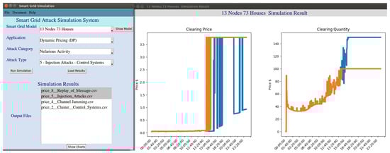 In this section, the results achieved in our experiments are demonstrated. The study analyzed the consequences of the simulated cyber-attacks on the energy providers and their customers in terms of financial and operational losses, total loads, clearing price, and clearing quantity. The principal objective of our research is to introduce a smart grid co-simulation environment that can be extended to simulate and analyze the various type of attacks and analyze their impact. Note that developers and smart grid researchers interested in attack simulation can easily extend the proposed framework with additional attack pattern libraries and simulation scenarios. However, only some selected results are discussed in this paper due to the scope of this study. In addition, the results of the simple test feeder, which is the smallest in this study, and the IEEE 13 node test feeder, which is the largest, are shown. The attack types selected, channel jamming and injection attack, are two of the most common attack types on the smart grid system defined by ENISA. Indeed, the co-simulation results in both metrics, including the total real-time load, current market-clearing price, current market-clearing quantity, and economic impact, are visually significant, which strongly supports cyber-security training for IT experts, cyber-security professionals, and even advanced/interested end-users.