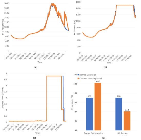 Figure 5 shows the results obtained in a one-day simulation for normal operation and the channel jamming attack scenarios. In Figure 5a, we can see the total real-time load of the system collected at the substation’s meter. Figure 5b presents the current market-clearing quantity, while the current market-clearing price is demonstrated in Figure 5c. Figure 5d presents the economic impact of the attack. Although the clearing quantity curves are identical, the clearing price and the total load curves are partly distinct from normal and attack situations. The peak hours are noticed from around 16:00 until around midnight. At approximately 16:00, the total feeder load exceeds the market’s pre-defined maximum capacity bid quantity. As a result, the market-clearing price has been increased to flatten energy consumption at the capacity limit as well as encourage more DR. Since there is more energy demand, the market-clearing price jumps to the price cap 3.8$/kWh, significantly affecting the cleared price for nearly 5 hours. At around 22:00, the clearing price curve under the channel jamming attack suddenly dropped to around $1, then slowly decreased to low prices. These low prices encouraged customers to purchase more energy. Consequently, the total load curve due to the channel jamming attack fluctuated and reached over 1600 kW. Note that, in a normal operation scenario, the clearing price and total load curves only decrease after the peak period.