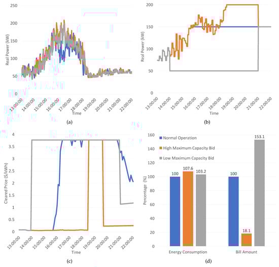 By injecting a false, small maximum capacity bid at 50 kW, less electricity is provided to the auction market. Consequently, the clearing price immediately hits the price cap at the beginning of the attack period and maintained the $3.78 value until it finished. Unfortunately, the efforts of end-users to adapt their electricity usage have limited impact, and DR function is less efficient. Therefore, the total energy consumption in this attack is 3.2% higher than the normal scenario, as depicted in Figure 6d. The highest total load is nearly 200 kW. Unfortunately, this is the most severe economic impact for the end-user, with a 153.1% bill amount increase when compared to the normal scenario.