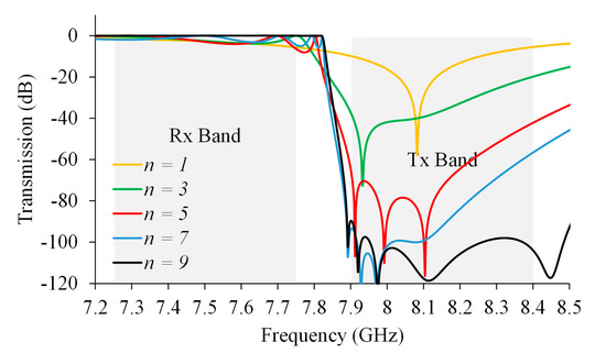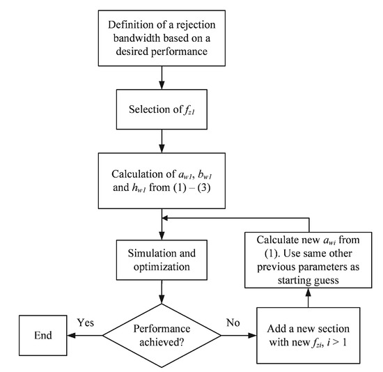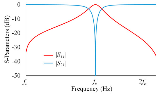 The design philosophy relies on setting transmission zeros within the rejection bandwidth until the value of |S21| < −90 dB is obtained with the minimum number of sections, n. The resonant frequencies fzi, i = 1…p, are selected, in a first approximation, as equally distributed within this bandwidth. It is worth noting that the filter is a symmetric structure and consequently the number of different fz is p < n, as described in (4).
