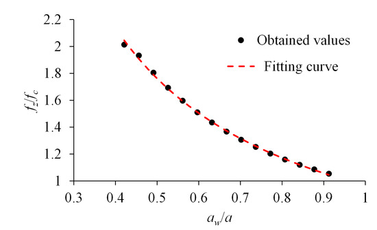 Using the common parameters values considered in the previous analysis and aw = 16.1 mm, then the unknowns in (2) are k2 = −0.6658 and m2 = 1.7036 for 0.08b < bw < 0.56b, while the unknowns in (3) are k3 = −0.6934 and m3 = 1.6664 for 0.04b < hw < 0.32b.