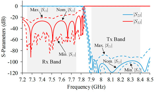 Simulated results of the designed Rx band filter with dimension from Table 1. Magnitude of S11 is plotted with red color whereas magnitude of S21 is plotted with blue color. Solid lines correspond to nominal values and dashed lines limit the maximum and minimum values obtained after performing a yield analysis with ±20 μm standard tolerance.
