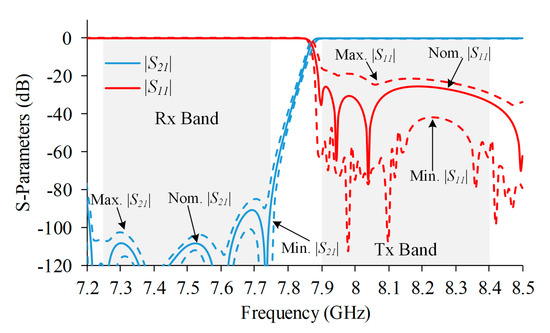 Simulated results of the designed Tx band filter with dimension from Table 2. Magnitude of S11 is plotted with red color whereas magnitude of S21 is plotted with blue color. Solid lines correspond to nominal values and dashed lines limit the maximum and minimum values obtained after performing a yield analysis with ±20 μm standard tolerance.