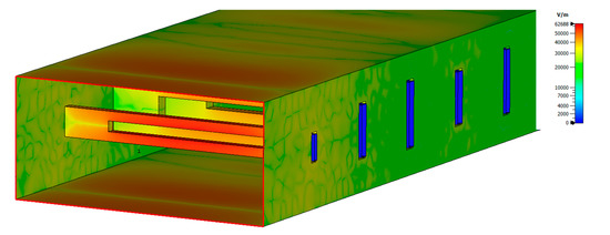 It is clear that the Tx filter represents the most limited structure in terms of power handling capabilities between the two designed filters for two reasons: it has the smallest bw value and the Tx band needs to withstand the transmitted power. Full 3D electromagnetic simulations with HFSS software have been carried out in order to obtain the maximum E-field value within this filter and thus to estimate the maximum power that the filter can handle. These simulations have shown a maximum value of electric field of around 6.3 × 104 V/m at 7.75 GHz for an input power of 1 W as shown in Figure 10. Taking into account that the air breakdown E-field value at sea level is 3 × 106 V/m, the maximum power that the filter can theoretically handle is near 2.3 kW. If a typical safety factor of 50% is considered, then it can be concluded that this filter can manage at least 1 kW, which should be enough for the intended application of SATCOMs. Regardless of this analysis, the iris gap (parameter bw) represents the most critical parameter in terms of power handling capability due to its small values that tend to concentrate the E-field. Therefore, power requirements for certain applications may impose a lower limit for this parameter, which could make it necessary to compensate this limitation, suitably modifying the other parameters within the structure.