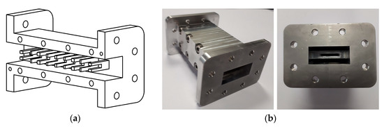The proposed filters are designed in such a way that they can be easily divided into two metallic blocks by their E-field symmetry plane. Thus, the insertion loss is minimized which assures the best performance for the SATCOM terminal both in reception, by increasing the sensitivity, and in transmission, by maximizing the power efficiency. In Figure 12a, a sketch of half Rx filter is shown. This part is identical to the complementary part due to the structure symmetry and it is similar to the corresponding Tx filter. Two pictures of the manufactured Rx filter are shown in Figure 12b.