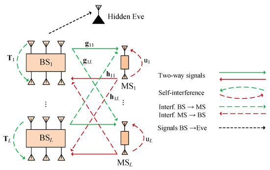 In this work, we consider a security scenario where a hidden eavesdropper exists and overhears the information from the base stations to the mobile users. In particular, the CSI of the eavesdropper is not collected by the base stations, since it might stay silent to hide the attack. To protect the data messages, the base stations will inject artificial noise along with the data to disturb and degrade the eavesdropping performance. The transmitted signal from base station to mobile user in the l-th two-way transceiver pair is represented by where denotes the precoded beamforming vectors, represents the artificial noise signal with a Gaussian distribution, i.e., with covariance matrix . In addition, with average power is the data symbol for proposed mobile user . Therefore, the average consumed power of base station is formulated by . On uplink, mobile user transmits the signal, with power and data symbol , where . As a result, the downlink received signal at is expressed as: