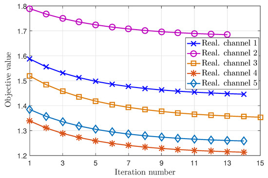 Figure 3 presents the convergence of the proposed iterative algorithm with the penalty function in several random realization channels where the parameters are set as follows: normalized error bound , convergent tolerance , and penalty factor . The penalty factor is chosen empirically to provide good convergent in experiments. As seen in Figure 3, the objective values of problem (33) decrease and converge in about 15 iterations. Moreover, the objective values converge to different points via the values of random channels.